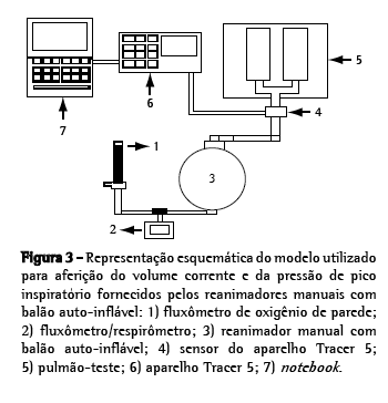 Foram utilizados um pulmão-teste (Vent Aid, TTL-49504; Michigan Instruments, Grand Rapids, MI, EUA), um aparelho de medida de mecânica respiratória (Tracer 5; Intermed, São Paulo, Brasil), um fluxomêtro de oxigênio de parede (Becton Dickinson, Franklin Lakes, NJ, EUA); um fluxômetro/respirômetro (953; Oxigel, São Paulo, Brasil) e um notebook com o software Wintracer, versão 3.3 beta (Intermed, São Paulo, Brasil). Foram testados sete modelos de reanimador manual com balão auto-inflável: Oxigel, modelos A e B; CE