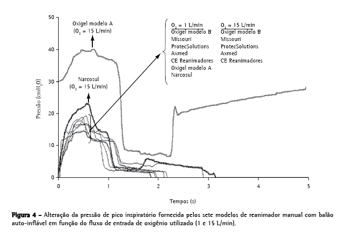 A Figura 4 mostra a alteração da pressão de pico inspiratório fornecida pelos reanimadores manuais auto-infláveis em função dos fluxos de entrada de oxigênio de 1 e 15 L/min durante o ciclo respiratório. Observa-se aumento da pressão de pico inspiratório fornecida pelos reanimadores Oxigel/modelo A e Narcosul ao receberem 15 L/min de oxigênio, o que não ocorreu nos outros modelos testados.