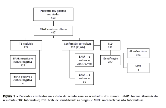Um total de 503 pacientes infectados pelo HIV foi recrutado (Figura 1). Dentre estes 503, 447 haviam realizado baciloscopia para BAAR e cultura em espécimes de catarro ou lavagem broncoalveolar. Resultados positivos da cultura para micobactéria foram obtidos em 320 pacientes. Destes 320, 235 (73,4%) também apresentaram baciloscopia positiva para BAAR. Todos os dados apresentados aqui são relacionados ao grupo de pacientes em que a infecção micobacteriana foi confirmada através de cultura (n = 320). Testes de sensibilidade às drogas foram realizados em 258 isolados. A identificação de micobactéria em nível de espécie foi atingida em 277 isolados. Um número substancial de isolados não pôde ser identificado (n = 43) ou não foi submetido a testes de sensibilidade às drogas (n = 62) devido a problemas de preservação durante o transporte. Apenas 3 isolados foram caracterizados como MNT. A Tabela 1 mostra as características demográficas dos pacientes que apresentaram infecções micobacterianas, como confirmado por meio de baciloscopia ou cultura. A maioria dos pacientes, independente do gênero, estava na faixa etária economicamente ativa. A predominância de pacientes negros reflete o perfil demográfico do país.