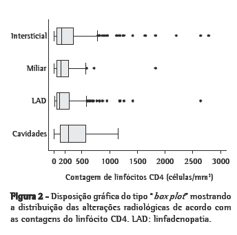 Perda de peso, febre e tosse foram os achados clínicos observados com maior freqüência, e 50,6% dos pacientes foram categorizados como Classe I. O padrão radiológico mais comum foi o intersticial (em 66,8%), seguido por linfonodomegalias mediastinais (em 30%) e bronquiectasias (em 27,5%). Nódulos miliares foram observados em 17,8% dos casos, e cavitação foi observada em 12,1%. Estes dados podem ser observados na Tabela 2. Todos os três indivíduos infectados com o MNT apresentaram manifestações clínicas bastante similares àquelas dos casos de infecção por M. tuberculosis. A mediana da contagem de linfócitos CD4 foi 151 células/­mm3, e a mediana da contagem de linfócitos total foi 1140,5 células/mm3. As cavidades observadas nas radiografias de tórax foram associadas às contagens de linfócitos CD4 > 200 células/mm3 (Figura 2).