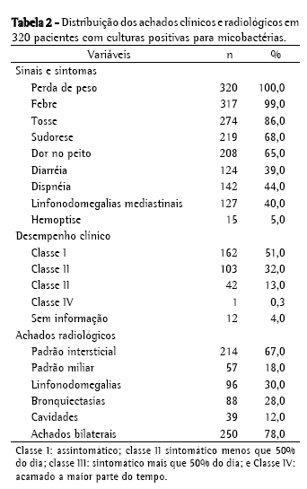 Em Moçambique, a AIDS e a TB estão firmemente estabelecidas. Comorbidades tais como infecção por malária, anemia falciforme, desnutrição e parasitas intestinais contribuem para a alta mortalidade observada entre tais pacientes. Em Moçambique, onde dados a respeito da TB e AIDS são incompletos, a TB está entre as 10 causas de morte passíveis de prevenção em Maputo.(10) Apesar de um programa nacional de tratamento da TB estar sendo conduzido por uma equipe paramédica desde 1985, os resultados têm sido frustrantes.(11) O presente estudo mostra que pacientes co-infectados por TB/HIV na área de Maputo têm baixos níveis de hemoglobina e albumina, provavelmente refletindo as condições mencionadas acima, tornando o tratamento de tais pacientes ainda mais difícil. A maior parte dos indivíduos afetados está na faixa etária economicamente ativa, o que implica em um grande peso socioeconômico. A apresentação clínica da TB na população estudada foi a clássica tríade de febre, suores, e tosse. Falta de ar combinada a alterações intersticiais observadas nas radiografias de tórax foi um achado comum, fazendo da pneumonia por P. jirovecii um dos principais diagnósticos diferenciais, especialmente entre aqueles com desidrogenase lática elevada, encontrada na maior parte dos pacientes avaliados. Em uma ampla série de casos e revisão da literatura,(12) as radiografias de tórax de pacientes co-infectados por TB/HIV foram analisadas. Os achados predominantes foram infiltrados, seguidos por infiltrado intersticial e linfadenopatia. Baixas contagens do linfócito CD4 foram associadas à linfadenopatia hilar/mediastinal e inversamente associadas a derrame pleural e doença cavitária. Nossos resultados corroboram aqueles achados; MNT foram isolados de amostras de catarro em apenas 3 casos. De acordo com outros relatos de países em desenvolvimento, onde a prevalência de TB é bastante alta, o isolamento de MNT é raro. Em um caso, o provável agente causador foi a M. simiae. Existem poucos relatos de infecção por M. simiae em pacientes infectados pelo HIV.(13-15) Apesar de sua associação à doença humana não ser freqüente, a infecção pulmonar com a M. simiae foi relatada em treinadores de macacos e outros indivíduos que tenham contato com estes animais,(16) bem como em pacientes com doença pulmonar pré-existente, como TB cavitária, carcinoma e doença pulmonar obstrutiva crônica.(13)