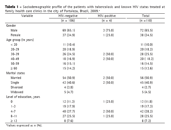 Dos 30 CSF sorteados e contatados, 26 devolveram os instrumentos de coleta devidamente preenchidos. Todos os pacientes consecutivamente atendidos nessas 26 unidades e com diagnóstico confirmado de tuberculose foram convidados a participar do estudo. Do total de 114 pacientes convidados, 4 (3,5%) não desejaram participar. Os 110 pacientes incluídos na pesquisa tiveram início de tratamento da tuberculose entre os meses de setembro de 2008 e maio de 2009. A média de idade dos pacientes foi de 40,3 ± 16,7 anos (variação: 16-90 anos). A Tabela 1 apresenta o perfil sociodemográfico dos 110 pacientes incluídos no estudo.