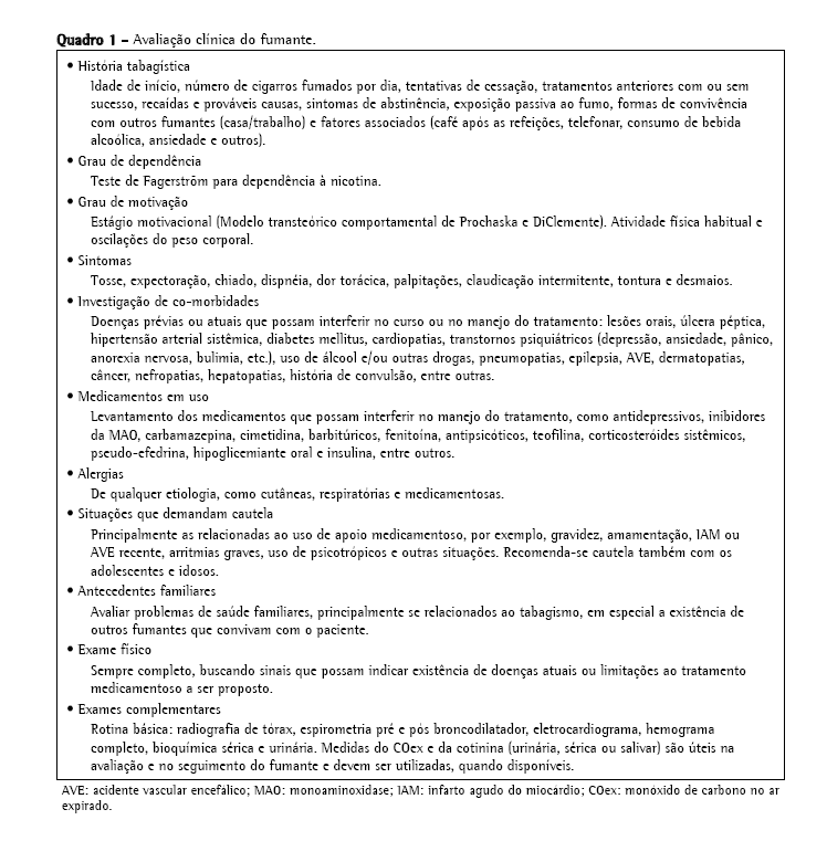 O fumante deve ser submetido a avaliação clínica no momento da admissão no programa de cessação do tabagismo. O objetivo é identificar alterações funcionais pulmonares, existência de doenças relacionadas ao tabagismo (DRT), possíveis contra-indicações e interações medicamentosas durante o tratamento farmacológico da dependência. É neste momento que também é avaliado o perfil do fumante, seu grau de dependência à nicotina e sua motivação para deixar de fumar.
