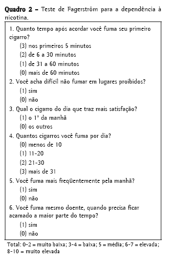 Um dos primeiros instrumentos desenvolvidos para avaliar a dependência à nicotina foi o Fagerström Tolerance Questionnaire (FTQ, Questionário de Tolerância de Fagerström), constituído de oito questões.(3) Um estudo posterior sugeriu um índice denominado heaviness of smoking index (HSI), resultante da combinação das medidas relacionadas ao tempo para consumir o primeiro cigarro do dia e o consumo médio diário de cigarros.(4)