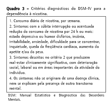 Outros critérios aplicáveis ao diagnóstico da dependência à nicotina são os do Diagnostic and Statistical Manual of Mental Disorders (Manual Estatístico e Diagnóstico das Desordens Mentais), em suas 3ª e 4ª edições (DSM-III e DSM-IV, respectivamente).(7,8) Com a exceção dos sintomas de abstinência específicos da nicotina descritos no DSM-IV, os critérios de dependência são aplicáveis a uma ampla gama de substâncias psicoativas.