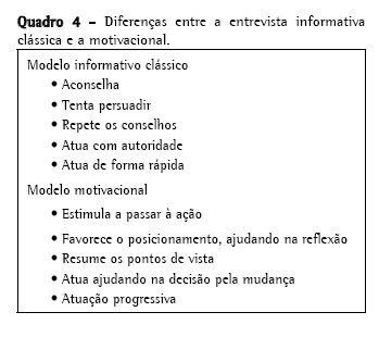 A entrevista motivacional (EM) é uma técnica de abordagem focada no fumante que se propõe a ajudar a resolver as ambivalências relativas ao tabagismo e a mudar o estágio comportamental.(20)