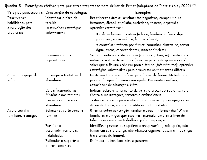 Os métodos baseados na terapia comportamental cognitiva (TCC)(15,30) são fundamentais na abordagem do fumante em todas as situações clínicas, mesmo quando é necessário apoio medicamentoso.(31)