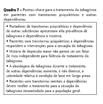 A comparação do presente conteúdo com o da diretriz anterior revela, mesmo num curto intervalo de tempo, o considerável progresso científico na área. A dependência do tabaco é cada vez mais reconhecida como uma condição crônica que pode necessitar de repetidas intervenções. Além disso, evidências recentes embasam o papel fundamental do aconselhamento tanto em intervenção isolada ou em grupo quanto associada ao tratamento farmacológico.