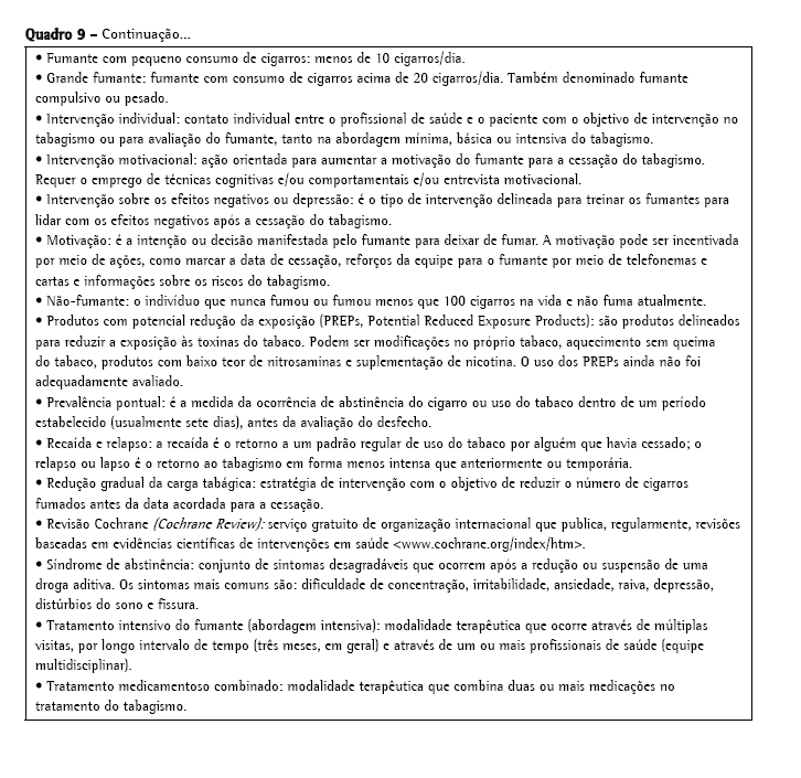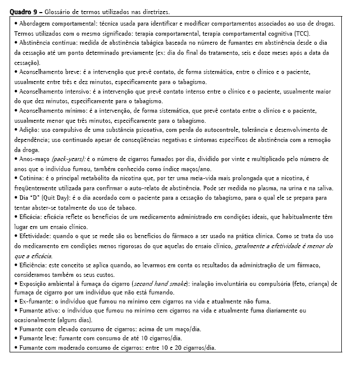 Estas diretrizes constituem uma ferramenta atualizada e abrangente para auxiliar o profissional de saúde na abordagem do tabagista, recomendando atitudes baseadas em evidências clínicas como a melhor forma de conduzir cada caso. De forma reduzida e mais objetiva possível, o texto final foi agrupado em dois grandes itens: Avaliação e Tratamento. Os dois itens apresentam comentários e níveis de recomendação das referências utilizadas, bem como algumas propostas de abordagem, como por exemplo, redução de danos, em situações específicas ainda pouco exploradas, como recaídas, tabagismo passivo, tabagismo na categoria médica e uso de tabaco em ambientes específicos.