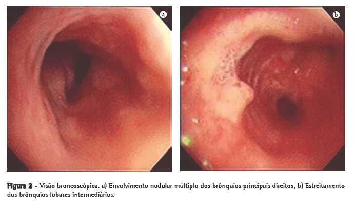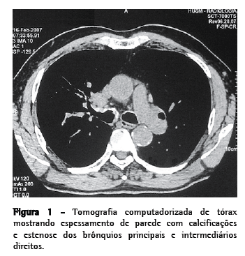 Homem de 67 anos, aposentado, hipertenso, ex-fumante e ex-etilista, foi encaminhado ao nosso serviço com queixas de dispnéia progressiva, sibilância e dor torácica nos últimos 6 meses. Uma radiografia de tórax obtida 8 anos antes mostrava aumento hilar direito. Tinha também uma história de longa duração de episódios de hemoptise que cessaram 10 anos antes, assim como uma história de infecções respiratórias recorrentes. No exame físico, apresentava murmúrio vesicular diminuído e crepitações leves nas bases pulmonares. Uma segunda radiografia de tórax apresentou as mesmas características da primeira. Os resultados dos testes de função pulmonar (espirometria e teste de caminhada de seis minutos) e dos testes laboratoriais estavam dentro dos limites da normalidade. Uma recente tomografia computadorizada de tórax mostrava estenose parcial dos brônquios principais e intermediários direitos e calcificações mucosas laminares que se estendiam do terço superior da traquéia para áreas estenóticas inferiores, assim como linfoadenomegalias mediastinais (Figura 1). Uma amostra de escarro induzido foi negativa para bactérias, bacilos álcool-ácido resistentes e fungos. O lavado broncoalveolar revelou um processo inflamatório inespecífico.