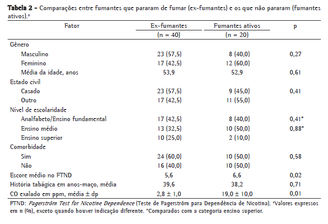 As características basais dos 60 pacientes estão descritas na Tabela 1. Mais da metade dos pacientes eram casados, do sexo masculino e apresentaram dependência de nicotina de moderada a alta (escores do FTND). O nível médio de CO exalado foi 3 ppm para os ex-fumantes e 19 ppm para os fumantes ativos.