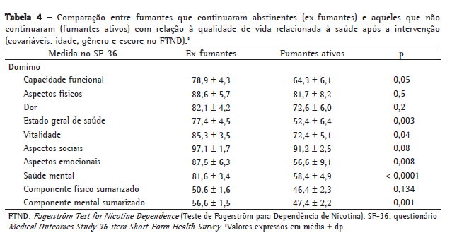 Após o ajuste para idade, gênero e escore no FTND, observamos que os ex-fumantes apresentaram melhores escores após a intervenção do que aqueles apresentados pelos fumantes ativos para os domínios estado geral de saúde, vitalidade, aspectos emocionais e saúde mental, bem como para o componente mental sumarizado (p = 0,001 para todos; Tabela 4).