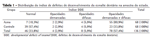 Opacidades difusas demarcadas, observadas em 34 pacientes (54%) do grupo com asma e em 16 (20,8%) do grupo controle, constituíram o defeito no esmalte mais prevalente observado nesta população (Tabela 1).