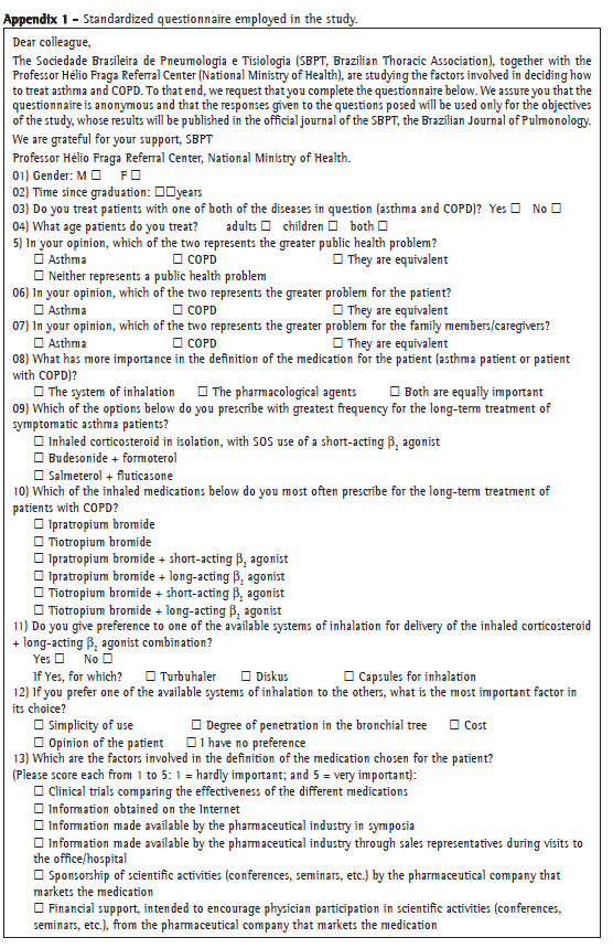 MethodsThis was a cross-sectional study carried out using a survey with a standardized questionnaire (Appendix 1), applied during the VI Brazilian Congress on Asthma, II Brazilian Congress on COPD and II Brazilian Congress on Smoking, all of which were held on August 22-25 of 2007 in the city of Belo Horizonte, Brazil. The pulmonologists who visited the SBPT booth were invited to complete the questionnaire.