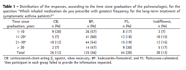 Although it is likely that most of the pulmonologists in Brazil know the diagnostic and therapeutic practices recommended in these consensuses, at times, other factors are involved in the pharmacological decision. One of the aims of the survey was to know more about the therapeutic approaches employed and the factors involved in the choice of the treatment regimen for the asthma patient, as well as for the patient with COPD. Table 1 shows the answers to the question regarding which is the pharmacological regimen most often employed in the long-term treatment of the symptomatic asthma patient. We were able to observe that, regardless of the time since graduation, the option "budesonide + formoterol" was chosen by a little more than half of the interviewees.