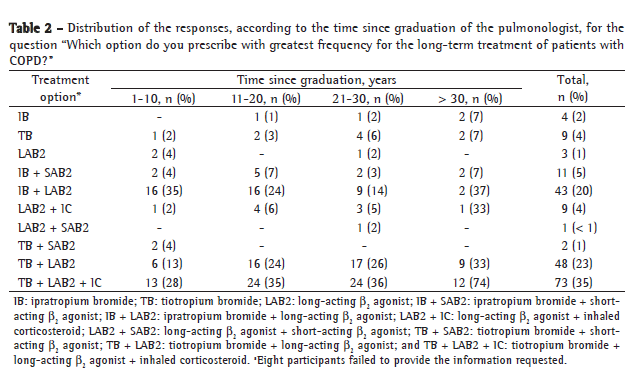 Table 2 shows the answers to the question about which is the therapeutic option most often prescribed for the long-term treatment of the patient with COPD. It is of note that the combination of tiotropium bromide, a long-acting β2 agonist and an inhaled corticosteroid seems to be the therapeutic regimen most frequently used by pulmonologists, regardless of time since graduation. This is followed by the combination of tiotropium bromide and long-acting β2 agonist.