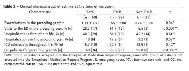 DiscussionThe criteria for patient acceptance into the EMR program, outlined in Complementary Directive SAS/MS 12, issued on 12 November, 2002,(4,10) were appropriate for the identification of the patients presenting the greatest disease severity. Those criteria stratified patients based on the frequency at which they used health care resources. The patients selected to receive medication from the EMR presented a higher number of emergency room visits in the preceding year, a higher number of exacerbations and a more frequent need for corticosteroid pulses. It is known that patients with severe asthma who achieve control of the disease visit the emergency room less frequently and are less likely to receive oral corticosteroid pulses, although these severity markers present no significant association with corticosteroid dependency.(17)