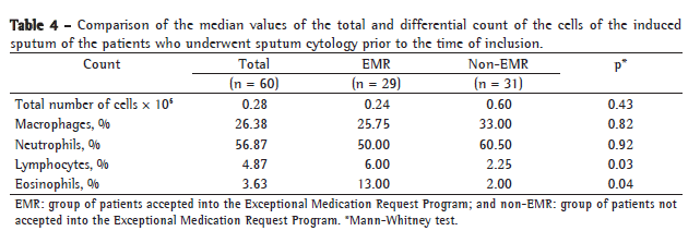 A reduction in the proportion of eosinophils in the induced sputum is to be expected in patients with controlled asthma.(25) In the present study, the inflammatory characteristics, evaluated by induced sputum cytology, differed between the two groups evaluated. Patients in the EMR group presented an increase in the number of eosinophils, which suggests a lack of disease control in this group. In the non-EMR group, the median number of eosinophils in the sputum was within the normal range, due to the greater proportion of controlled patients in this group (Tables 2 and 4).(24) Therefore, induced sputum cell counts can be used as a marker and add quality to the monitoring of the asthma treatment, as well as correlating with the use of inhaled corticosteroid.(27) The higher number of lymphocytes in the sputum of patients in the non-EMR group was not a significant difference and has no clinical relevance.