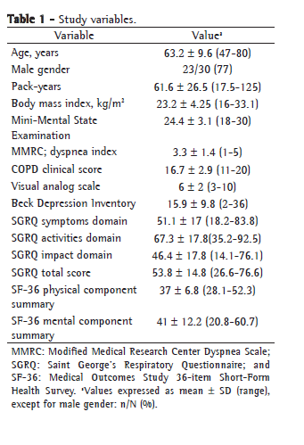 MethodsThe present study was carried out at the Pereira Filho Ward of the Santa Casa Hospital Complex in Porto Alegre between May and September of 2006. The study design was cross-sectional, and the inclusion criteria were as follows: physician-diagnosed COPD; a smoking history of at least 15 pack-years; being over 45 years of age; and absence of exacerbations of the disease during the 30 days preceding the interview. The exclusion criteria were a history of asthma, presence of another concomitant respiratory disease, previous surgery or thoracic radiotherapy, a history of neoplasm, presence of severe comorbidity and illiteracy.