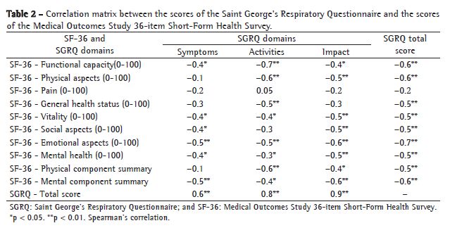 Even in the international literature, we found no English-language studies whose primary objective was clearly this comparison. However, we must ask the question "What is the objective of comparing these questionnaires?" First, the objective of using the SGRQ is to assess QoL specifically in COPD patients. Therefore, it would be expected that all the correlations with clinical and functional variables, as well as with those involving patient health perception, would be stronger with the use of the SGRQ than with the use of the generic SF-36. This hypothesis seems to have been demonstrated, according to the results of the present study. This is important, since it reinforces the previous work performed to validate the SGRQ.(11,12)