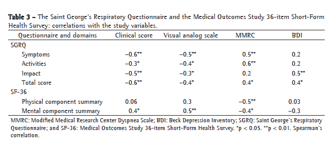 In terms of how the SGRQ and the SF-36 correlated with the other variables studied, the strongest correlation was between the SGRQ symptoms domain and the clinical score (r =−0.6; p < 0.01), followed by the correlation between the activities domain and the MMRC score (r = 0.6; p < 0.01). For the SF-36, the strongest correlations were between the MCS and the VAS (r = 0.5; p < 0.01) and between the PCS and the dyspnea score (r = −0.5; p < 0.01). The BDI score correlated only with the SGRQ impact domain (r = 0.5; p < 0.01; Table 3).