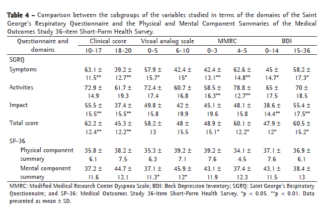 The comparison between the subgroups of the variables studied and the SGRQ, as well as the SF-36, is presented in Table 4. Considering the 50th percentile, the variables studied were divided into the following subgroups: clinical score (Group 1: score 10-17; Group 2: score 18-20); VAS (Group 1: score 0-5; Group 2: score 6-10); dyspnea as assessed by the MMRC score (Group 1: 0-3; Group 2: 4-5); and BDI score (Group 1: 0-14; Group 2: 15-36). The SGRQ symptoms domain was the only one that presented statistically significant differences in comparison with all of the subgroups of the following variables: clinical score; dyspnea score; VAS; and BDI. In the activities domain, the only significant difference concerned the variable dyspnea score (20.3 points). In the impact domain, there were significant differences in comparison with the variables clinical score (18.1 points) and BDI (16.8 points). In the SF-36, the MCS score showed a statistically significant difference in comparison with the subgroups of the variable VAS (difference of 8.8 points). In the SGRQ total score, the VAS was the only variable in which there was no difference between the subgroups (Table 4).