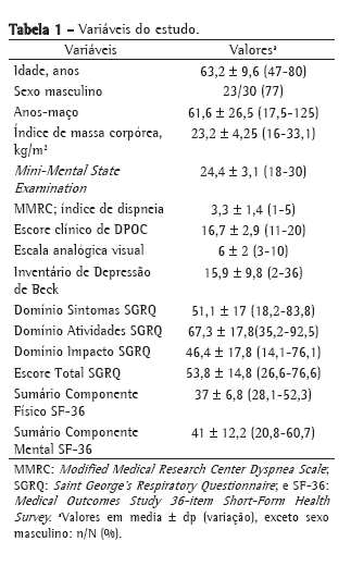 Todos os pacientes preencheram um termo de consentimento informado, sendo o mesmo aprovado pelo Comitê de Ética e Pesquisa da instituição. Foram incluídos 30 pacientes no estudo, e todos os instrumentos de avaliação foram aplicados em uma ordem padronizada por um único entrevistador. O tamanho da amostra foi de conveniência. Não houve nenhum paciente excluído do estudo. Foram utilizados os questionários SF-36, versão em português brasileiro, e o SGRQ, versão modificada em português brasileiro. O SF-36 é autoaplicativo, constituído de 36 questões e subdividido em 8 domínios: capacidade funcional, dor corporal, vitalidade, saúde geral, função social, função física e emocional e saúde mental. Esses domínios podem ser agregados em dois grandes grupos: Physical Component Summary (PCS, Sumário do Componente Físico) e o Mental Component Summary (MCS, Sumário do Componente Mental). O valor varia de 0 a 100, e números maiores representam uma melhor QVRS.(3,4) O SGRQ é autoadministrado, composto de 50 itens e dividido em três domínios: sintomas (8 itens), atividade (16 itens) e impacto (26 itens). Cada item tem um peso derivado, e os valores mais baixos indicam uma melhor QVRS.(3) A ordem de preenchimento desses dois questionários foi randomizada. As outras variáveis mensuradas no estudo foram o grau de dispneia pelo escore de Modified Medical Research Council Dyspnea Scale (MMRC, escala de dispneia modificada do Conselho de Pesquisa Médica), a qual classifica a dispneia em 5 categorias (0-5), e o estado afetivo, através do escore do Inventário De Depressão de Beck (IDB), que contém 21 perguntas com um escore que varia de 0 a 63 pontos. Além destes, foram avaliados a percepção do estado geral de saúde através do escore de uma escala visual analógica (EVA), na qual 0 equivale à morte e 10 ao melhor estado de saúde possível, e um escore clínico de DPOC, criado especialmente para o estudo por dois pneumologistas, e baseado em um questionário contendo 10 perguntas sobre sintomas, exacerbações, hospitalizações, visitas à emergência e uso de medicações de resgate. O escore desse instrumento varia de 10 (pior escore) a 20 (melhor escore). Outro instrumento utilizado foi o questionário Mini-Mental State Examination (MMSE) para avaliar o estado mental-o nível de cognição-para estratificar os pacientes em dois grupos: aqueles com escore < 25 e aqueles com escore ≥ 25. O objetivo do uso desse instrumento foi avaliar possíveis diferenças entre os escores dos demais questionários nesses dois grupos. Na análise dos dados foram utilizadas médias, medianas e desvios-padrão. O nível de significância estatística foi de 0,01. Foram comparados e correlacionados o escore geral e os escores dos respectivos domínios dos questionários SF-36 e SGRQ, utilizando-se os coeficientes de Spearman. Cada variável comparadora (MMRC, EVA, IDB e escore clínico) foi dividida em dois grupos, sendo o ponto de corte o percentil 50 dos valores de cada variável. Os escores do SF-36 (PCS e MCS) e do SGRQ (escore total e domínios) foram comparados entre os grupos utilizando-se o teste não-paramétrico de Mann-Whitney. O programa utilizado foi o SPSS, versão 11.0.1 (SPSS Inc., Chicago, IL, EUA).