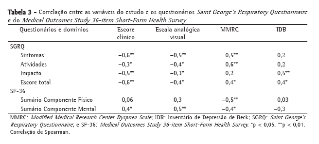 Em relação à correlação do SGRQ e do SF-36 com as variáveis estudadas, a maior correlação observada foi entre o domínio sintomas do SGRQ e o escore clínico (r = −0,6; p < 0,01), seguido pela correlação entre o domínio atividades e MMRC (r = 0,6; p < 0,01). No SF-36, as maiores correlações foram entre o MCS e a EVA (r = 0,5; p < 0,01) e entre o PCS e escore de dispneia (r = −0,5; p < 0,01). A única correlação do escore do IDB foi com o domínio impacto do SGRQ (r = 0,5; p < 0,01; Tabela 3)