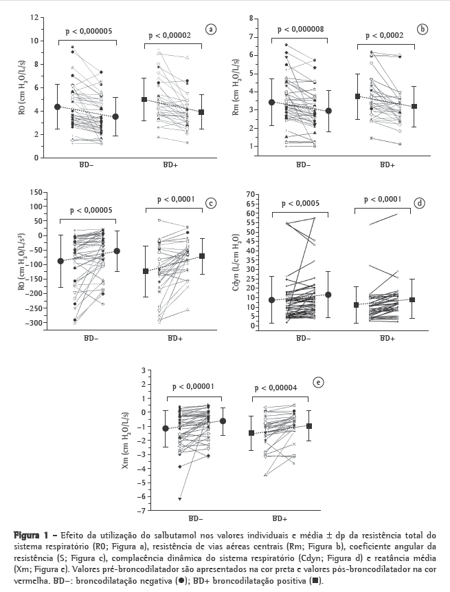 Os resultados apresentados na Figura 1e mostram que a Xm aumentou após a administração de salbutamol inalatório. Em concordância com estes resultados, os valores de reatância se tornaram mais positivos após o uso de salbutamol em um estudo realizado em um único paciente com DPOC.(27) Outros autores,(10) estudando 20 pacientes com DPOC, também observaram um aumento significativo da reatância após o uso de salbutamol. Este aumento pode ser explicado pela elevação da complacência das vias aéreas e pela diminuição da resistência periférica. O aumento da Xm observada no presente estudo é coerente com o comportamento da reatância medida em 5 Hz em um estudo,(2) no qual os autores relacionaram a melhora da reatância à broncodilatação de pequenas vias aéreas, causando uma redução na obstrução e resultando em melhora da complacência pulmonar.