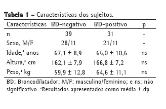 Foram avaliados indivíduos provenientes do ambulatório de DPOC do Hospital Universitário Pedro Ernesto (HUPE), na cidade do Rio de Janeiro. Os pacientes foram avaliados consecutivamente e classificados em dois grupos, de acordo com o teste de resposta broncodilatadora. O primeiro grupo foi composto por indivíduos com resposta broncodilatadora, identificada com base na presença de variação do VEF1 de 12% e 200 mL e/ou da CVF de 350 mL, previstos após o uso de 300 µg de salbutamol inalatório.(21) Este grupo foi denominado "BD-positivo". O segundo grupo incluiu indivíduos sem resposta broncodilatadora, conforme os critérios da Sociedade Brasileira de Pneumologia e Tisiologia,(21) e foi denominado "BD-negativo". Foi solicitado aos pacientes que se abstivessem do uso de broncodilatadores de ação curta por 6 h e de broncodilatadores de ação longa por 12 h. Os pacientes avaliados se encontravam em condições clínicas estáveis. Foram excluídos do estudo pacientes com asma, sinusite e rinite, ou que tiveram TB, pneumonia e infecções respiratórias nas 3 semanas anteriores à realização do teste, assim como aqueles que não realizassem adequadamente os testes de espirometria ou a TOF. A exclusão do diagnóstico de asma foi feita por meio da análise da história clinica dos pacientes. O presente estudo foi aprovado pelo Comitê de Ética do HUPE e seguiu as especificações da Declaração de Helsinki. Todos os indivíduos realizaram as provas de função pulmonar após a assinatura de um formulário de consentimento esclarecido.