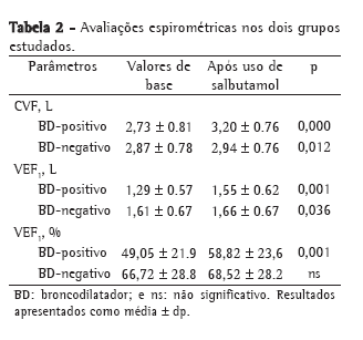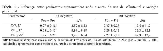 No grupo BD-negativo, os valores das diferenças e as variações percentuais dos parâmetros espirométricos foram menores do que os associados ao grupo BD-positivo (Tabela 3).
