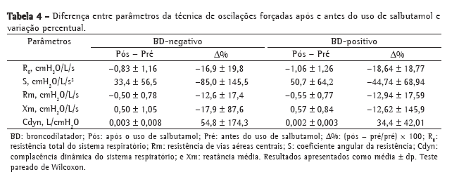 O sistema utilizado para as análises da TOF aplica sinais senoidais de pressão com ­frequências múltiplas inteiras de 2 Hz na faixa compreendida entre 4 e 32 Hz. A medição da pressão aplicada e do fluxo resultante permite estimar a impedância respiratória por meio da análise de Fourier.(16,17,22) Para a avaliação da resposta broncodilatadora pela TOF, foram utilizados os parâmetros provenientes das curvas de resistência e reatância do sistema respiratório. Através da regressão linear da curva de resistência, efetuada na faixa de frequência de 4 a 16 Hz, foi obtida a resistência no intercepto (R0) e o coeficiente angular da resistência (S), além da resistência média compreendida entre 4 a 16 Hz (Rm). A R0 está associada à resistência total, S se relaciona com a homogeneidade do sistema respiratório, enquanto Rm está associada à resistência de vias aéreas centrais.(16,17,22) Através da reatância obtida em 4 Hz, foi calculada a dynamic compliance (Cdyn, complacência dinâmica) do sistema respiratório (Cdyn = −1/2ω × f × Xrs, 4Hz), sendo também obtida a reatância média (Xm), que está associada à homogeneidade do sistema respiratório.