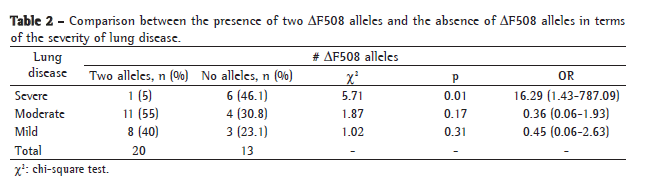 In contrast to the findings of other studies, in the analysis of pulmonary disease severity and of the presence of ΔF508 alleles, we identified fewer ΔF508/ΔF508 homozygotes among patients with severe lung disease, showing a lack of association between being ΔF508 homozygous and presenting greater lung disease severity.