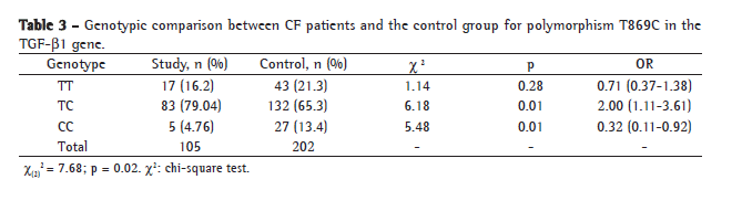 In the analysis of the T869C polymorphism in the TGF-β1 gene, the sample of CF patients was not found to be in HWE (χ(2)2 = 21.24; p = 0.000024). The control sample was found to be in HWE (χ(2)2 = 10.58; p = 0.005). In the genotypic comparison, there was a significant difference between CF patients and those in the control group in relation to the TC and CC genotypes, the TC genotype being identified as a risk factor (p = 0.01; OR = 2.00; variation, 1.11-3.61; Table 3).