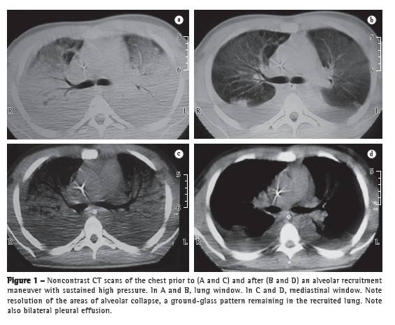 Even when they are successfully performed, ARMs need the support of higher PEEP values in order to promote alveolar stability in the newly recruited lung regions. In the case reported here, the ideal PEEP was determined by titration in function of the variation in static compliance in the PCV mode.(7)