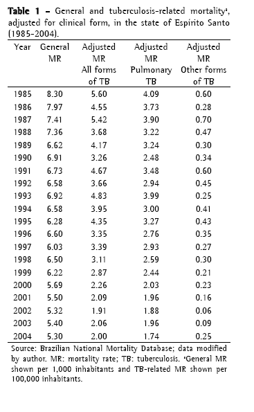 The specific mortality rate adjusted for TB of all forms was similar to the general mortality rate. For the specific mortality rate, the reduction was from 5.6/100,000 inhabitants in 1985 to 2.0/100,000 inhabitants in 2004, compared with a reduction from 8.3/1,000 inhabitants for 5.3/1,000 inhabitants for the general mortality rate in the same period.