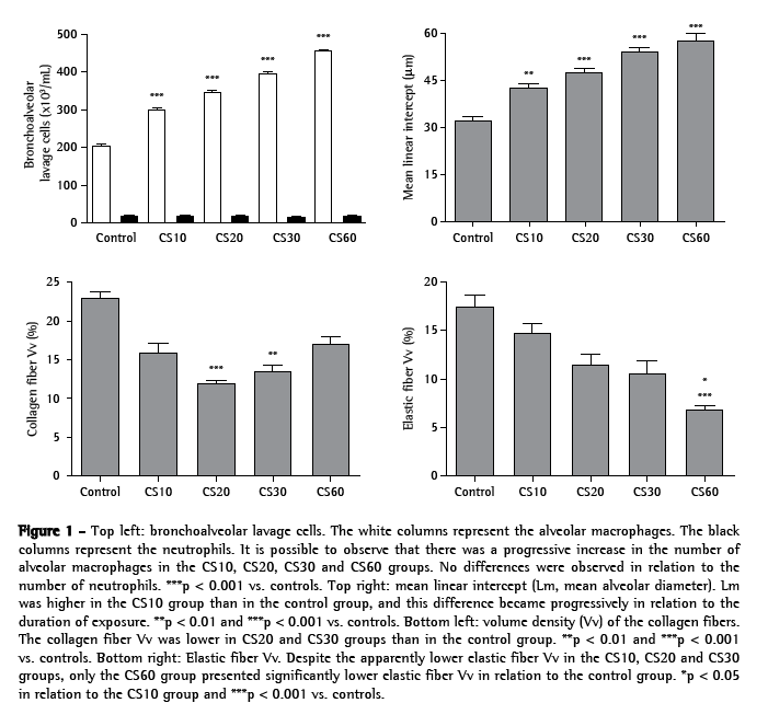 Cigarette smoke is a complex mixture with over 4,000 chemical components, being the major risk factor for chronic obstructive pulmonary disease (COPD) and emphysema, the latter appearing to be the more severe consequence.(1) The protease/antiprotease theory in emphysema induced by cigarette smoke is based on a chronic inflammatory response in the lower respiratory tract, where the inflammatory cells liberate a great variety of proteases, which superimposes on the antiproteolytic defenses, with subsequent degradation of the connective tissue.(2) The loss of lung elastic recoil and the histological evidence of damage of the elastic fibers (eFs) necessarily imply degradation of elastin as a key factor in the pathogenesis of the emphysema.(3) Some researchers consider neutrophils to be the principal cells involved in elastolytic injury.(4,5) However, there is evidence that alveolar macrophages are the principal cells responsible for the destruction of the lung architecture.(6,7)