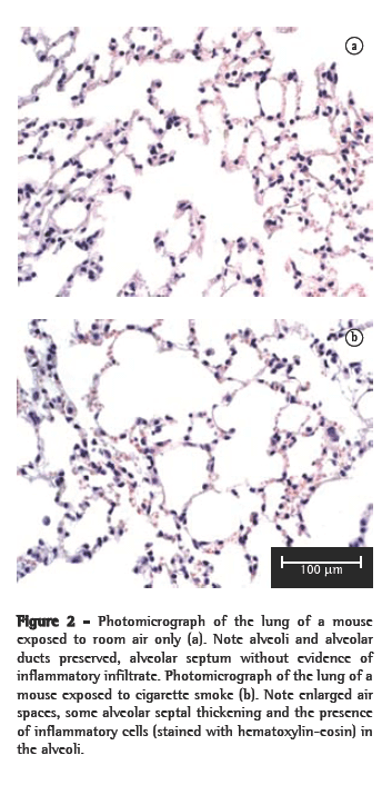 In a previous study, septal thickening and air space enlargement were described in C57BL/6 mice after 60 days of exposure to cigarette smoke.(7)