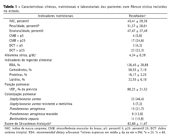 A insuficiência pancreática era presente em 63 pacientes (91,3%), e o diabetes melito relacionado à FC, em 2 (2,9%). Apenas 3 pacientes (4,3%) da amostra faziam uso de terapia nutricional enteral (gastrostomia). A média do escore de Shwachman-Kulczycki mostrou-se satisfatória (>71,0%) em 55 pacientes (79,7%). A caracterização da amostra de acordo com os parâmetros nutricionais e clínicos e dados de função pulmonar e de colonização bacteriana encontra-se descrita na Tabela 1.