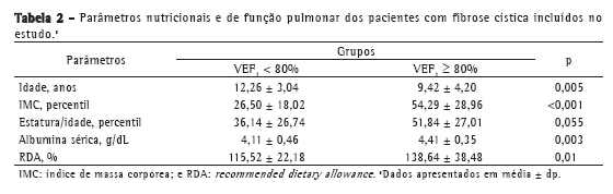 A análise da amostra em relação ao desfecho demonstrou que pacientes com valores de VEF1 < 80% apresentaram concomitantemente parâmetros nutricionais inferiores (Tabela 2). Pacientes com função pulmonar preservada (VEF1 > 80%) apresentaram idade, em média, 2,8 anos menor que os que apresentavam VEF1 < 80%. O nível de albumina sérica, apesar de se encontrar dentro da normalidade, apresentou média inferior nos pacientes com comprometimento pulmonar maior. Em relação à ingestão alimentar, foi possível observar que os pacientes com VEF1 < 80% não atingiram, em média, a recomendação nutricional para FC, que é > 120% da recommended dietary allowance (RDA).