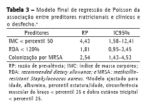 O desfecho do presente estudo, entretanto, não é explicado unicamente pelo comprometimento do estado nutricional. A ingestão alimentar e a colonização bacteriana são outros fatores que também interferem no desfecho. Na análise de regressão de Poisson com variância robusta, ajustada para a idade, percentil de IMC, nível de albumina, percentil E/I, CMB < percentil 25, DCT < percentil 25 e colonização por MRSA, a ingestão calórica abaixo de 120% da RDA apresentou uma associação limítrofe para predizer a piora da função pulmonar, devido ao baixo poder da amostra. Por outro lado, a presença de colonização por MRSA se mostrou fortemente associada com o desfecho estudado. Dasenbrook et al.(27) observaram uma associação entre a colonização por MRSA em pacientes com FC e a piora da sobrevida. Pacientes com MRSA apresentaram 27,7 mortes por 1.000 pacientes/ano, enquanto os não colonizados apresentaram 18,3 mortes por 1.000 pacientes/ano. A proporção de risco atribuído de mortalidade associada com MRSA foi de 34%.