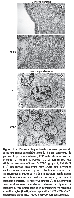 Um total de 27 tumores foi selecionado para morfometria: 7 tumores carcinóides típicos; 5 tumores carcinóides atípicos; 8 CNEGCs; e 7 carcinomas de pulmão de pequenas células (CPPCs).