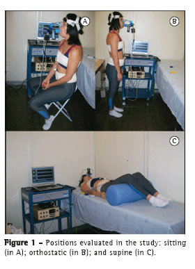 The sequence in which the calibration methods and the positions were to be tested was established by random sampling. The study protocol comprised the following steps: obtaining anthropometric data (weight and height) with the use of a calibrated mechanical scale (Welmy S.A., Santa Bárbara do Oeste, Brazil); performing pulmonary function tests (Quark PFT; Cosmed, Rome, Italy); calibrating the electrical signals emitted by the elastic bands; calibrating the flow to be measured by the pneumotachograph; placing the two elastic bands, which were adapted to the size of the subjects, around the chest and abdomen for movement transduction; randomizing the sequence in which the calibration methods (ISOCAL and QDC) were to be tested; and randomizing the sequence in which the (supine, sitting, and orthostatic) positions were to be tested.