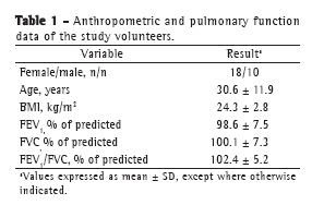 We evaluated a convenience sample of 28 adult volunteers (18 women and 10 men; age, 18-65 years) with no history of disease. The exclusion criteria were being a smoker, having been diagnosed with a respiratory disease, having difficulty in understanding explanations and instructions on how to perform the respiratory maneuvers, having a rib cage deformity, having a musculoskeletal disease that altered respiratory mechanics, and presenting with spirometric changes. The local research ethics committee approved the study (Protocol no. 1221/09), and all volunteers gave written informed consent.