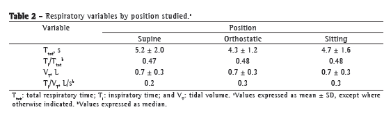 With regard to the contribution of the thoracic and abdominal compartments, we found that, in the three positions evaluated, the contribution of the rib cage was greater than was that of the abdomen, given that the K values obtained with ISOCAL were greater than 1.0 in the supine, sitting, and orthostatic positions (1.5 ± 0.4; 2.4 ± 0.9; and 1.9 ± 0.7, respectively). The addition of the flow monitoring system allowed accurate evaluation of the respiratory variables, which were measured during baseline breathing (Table 2).
