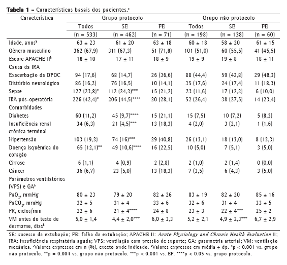 Dos 533 pacientes incluídos no grupo protocolo, 226 (42,4%) estavam em pós-operatório, 127 (23,8%) foram admitidos com sepse e 94 (17,6%) tinham DPOC. A média de idade foi de 63 ± 23 anos, a pontuação média no APACHE II no momento da admissão foi de 18 ± 10 e 67,9% eram homens. A extubação falhou em 71 pacientes (13,3%), dos quais 26 (36,6%) tinham DPOC (Tabela 1).
