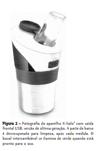 Em 2007, um novo aparelho para o registro da temperatura do ar exalado (X-halo®; Delmedica Investments Pte Ltd., Singapura) também demonstrou que essa temperatura é mais elevada em asmáticos não controlados.(9) Com o uso desse aparelho, o método foi simplificado, pois a expiração é feita diretamente no aparelho, que tem o mesmo princípio de uma garrafa térmica e retém o calor em seu miolo de cobre até a estabilização da temperatura, que tende a sofrer uma menor interferência do meio externo (Figura 1). O platô medido também torna cálculos da diferença de temperatura, ou a medida do pico térmico, desnecessários.