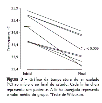 Os pacientes também foram submetidos a anamnese específica. Após a assinatura do termo de consentimento livre e esclarecido, procedeu-se à mensuração da temperatura do ar exalado e, em seguida, à prova de função pulmonar com um espirômetro MicroDL (Micro Medical Ltd., Kent, Reino Unido) e com o programa Spida 5 (Micro Medical Ltd.), estando os pacientes em posição ortostática e com clipe nasal. Avaliou-se VEF1, que foi expresso em relação aos valores previstos para sexo e idade segundo as diretrizes da Sociedade Brasileira de Pneumologia e Tisiologia.(11) Para cada medida de função pulmonar, considerou-se a melhor curva de três medidas consecutivas.