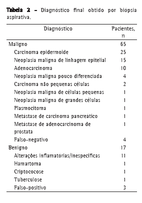 Dos 17 com diagnóstico confirmado de lesões benignas, 3 (17,6%) apresentaram resultados de análise citológica sugestivos de neoplasia. Os casos foram levados à cirurgia, sendo que 1 paciente recebeu o diagnóstico de fibrose pulmonar e 2 de granuloma por tuberculose (Figura 1).