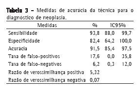 A acurácia para o diagnóstico de lesões malignas varia de 70-100%.(7,9,10,13-18) Resultados falso-positivos são normalmente abaixo de 4%.(7) A acurácia aqui apresentada para lesões malignas foi de 91,5%, e a taxa de falso-positivos foi de 17,6% (3 casos), sendo todas as análises citológicas sugestivas de neoplasia, mas não confirmatórias. Esses 3 casos foram levados à biópsia cirúrgica, com diagnóstico final de tuberculose pulmonar, em 2, e fibrose pulmonar, em 1.